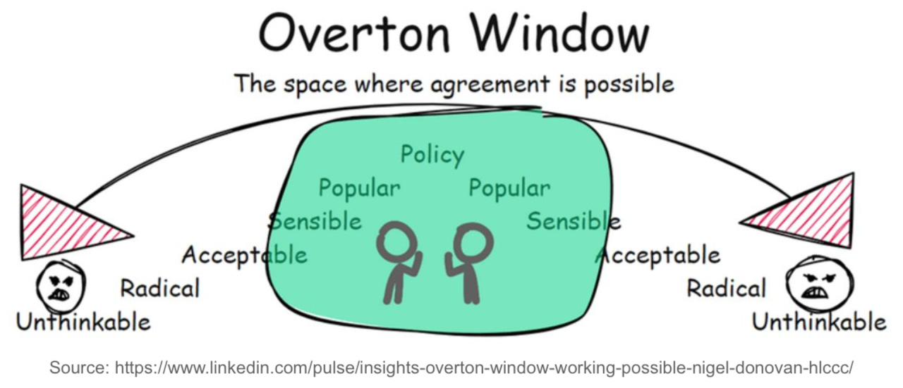 I’m guessing that some of my readers might need a refresher on The Overton Window. The model refers to what is politically possible (basically assuming a two-party system).