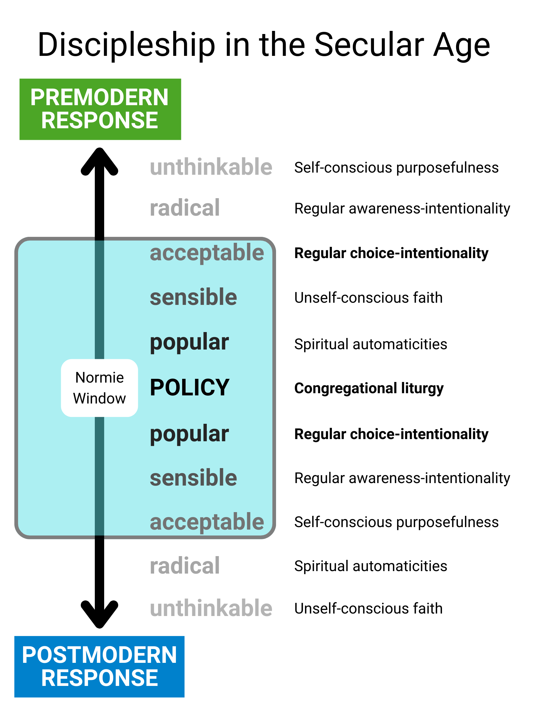 God’s purposes. This brings me to my final thought. I mentioned “becoming a company of disciples whose daily life together attests to the kingdom of God.” Becoming is a key word.5 If (!) my adaptation of The Overton Window is accurate, the self-conscious purposefulness of normie Christians is somewhere around “acceptable” for Richard and “unthinkable” for Brad. Maybe the simplest way to plot my viewpoint in relation to theirs is to say that, for me, self-conscious purposefulness is the goal of discipleship. For the missional church, it belongs at the POLICY position. It is the point of congregational liturgy, choice-intentionality, and awareness-intentionality. When spiritual automaticities and unself-conscious faith fail to serve self-conscious purposefulness, they are a problem.
